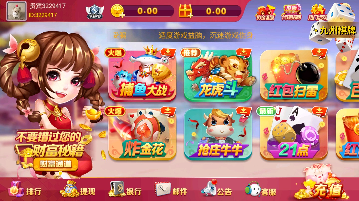 九州棋牌多种多样,有麻将、鬭地主、牛牛、跑得快等等多种游戯,让玩家可以享受到更多的乐趣!